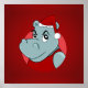 Poster com uma ilustração de um hipopótamo feliz e bonito com um chapéu de Papai Noel vermelho e branco; design de Natal para crianças, em um fundo vermelho
