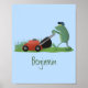 Um sapo verde engraçado cortando a grama no estilo de desenho animado do bobo.
