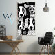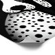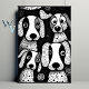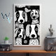 Um padrão preto-e-branco com pequenos cachorros ao fundo, no estilo da ilustração de pop, desenhos surrealistas, faces digitais expressivas, formas de mosaico.