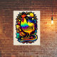 Este galo é representado num estilo de desenho animado e divertido, com penas brilhantemente coloridas. O efeito geral do trabalho de arte é caprichoso e lúdico, com senso de diversão e humor. As cores brilhantes e a composição animada fazem dela uma escolha ideal.