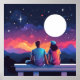 Uma bela pintura digital de um casal sentado no telhado à noite, olhando para as estrelas. O céu está cheio de estrelas de todas as cores, e a Via Látea é visível a distância. O casal está sentado próximo, e eles parecem estar gostando da companhia um do outro e da beleza do céu noturno.