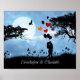 Um casal beijando a silhueta no parque com balões, árvores, pássaros, borboletas, flores e a lua de cheio. Celebre o amor. Pronto para ser personalizado com um nome de casal ou apagar os nomes.