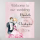 Uma poster de "bem-vinda ao nosso casamento". Personalize com sua data e nomes. Uma ilustração elegante definida sobre um fundo cor-de-rosa com rosas rosa esmaecidas. Uma ilustração do casal de casamento rico num abraço amoroso pintado com aquarelas. Chic e clássico com um talento antiquado.