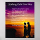 Nada Dourado Pode Ficar é uma foto de uma bela foto de uma silhueta de um jovem casal apaixonado, parado pela costa do mar com a bela luz azul roxa e laranja e amarela do céu. Este poema é escrito em texto branco. Nada Dourado Pode Ficar é um poema popular O bem amado poema escrito por Robert Frost em 1923 é maravilhosamente ilustrado com as cores brilhantes do sol brilhando do mar.