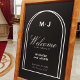 Na moda personalizado simples e minimalista, sinal de poster de boas-vindas preto e branco. Ideal para casamentos elegantes de preto e branco. O arco duplo representa duas pessoas se tornando uma em suas vidas juntas. Este design é definido como um modelo para sua fácil personalização on-line.
