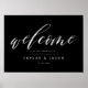 Mínimo e elegante sinal de boas-vindas para mostrar como um belo sinal de boas-vindas de convidado. O sinal de boas-vindas design apresenta "Bem-vindo" em uma tipografia moderna de caligrafia branca. Personalize com o nome da noiva e do noivo e a data do casamento. O fundo preto acrescenta uma aparência sofisticada.