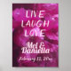 Rir ao Vivo do Amor! Estas são as suas posters de casamento para receber os seus convidados. Use o máximo que precisar para marcar as direções do(s) local(es) de casamento. Florais em roxas espantosas, com letras cor-de-rosa pálidas para as palavras. É fácil personalizar os nomes, a data e a mensagem especial. Fotografia floral mostra detalhes das pétalas de flores. Faça cada momento do seu dia de casamento tão lindo quanto você!
