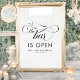 Casamento de Script Elegante O Bar é Poster de Bebidas Abertas. Personalize todo o texto e gráficos para corresponder perfeitamente às cores do evento.