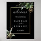 Este sinal de boas-vindas do casamento apresenta folhas de palmeiras de aquarela, folhas de bananeira, folhas tropicais exóticas e folhas de ouro falso com uma falso estrutura retangular de ouro. É perfeito para um casamento tropical, praia, verão ou destino.