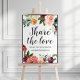 A placa de na moda do poster de casamento convida os convidados a "Compartilhar o Amor" compartilhando suas fotos com uma hashtag de casamento específica nas redes sociais. Design apresenta um verão e cai no design floral de coroa floral russa com belos rosas, dahlias, flores de pénia, e verde, em uma linda paleta de outono de vermelho escuro, amarelo ouro, laranja pêssego, rosa claro e tons de verde.