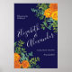 Poster Casamento Moderno Floral Rosa Azul e Laranja