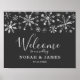 Bem-vinda elegante para seu casamento no inverno. Há falso flocos de neve com brilho prateado no topo do design. Sob isso diz "Bem-vindo ao nosso casamento" na fonte moderna do roteiro. Então, lista o nome do casal e a data do casamento. Os textos são editáveis.