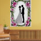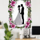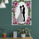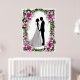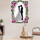 Uma representação de noiva e noiva na silhueta rodeada por um quadro floral com flores vibrantes, simbolizando amor e comprometimento, perfeita para convites para casamento, cartas ou designs de temas românticos.