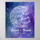 Art Nouveau Retro Vintage Lua crescente desenhada à mão "Eu te amo na lua e atrás" Design da tipografia no Bright Blue Starry Sky Personalizou o Romântico Namorados do presente para o casamento, presente para o presente, Poster decorativo. Personalize-o com nomes de casais, data de casamento ou personalize-o ainda mais se você quiser alterar a fonte, o tamanho e a cor do texto, bem como mover/redimensionar a imagem.