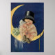 Ilustração de vintage: amor e romance imagem de casamento apresentando um lindo casal de bebê sentado em uma lua crescente no céu noturno com estrelas cintilantes. A noiva tem um véu puro e um buquê floral de flores para o casamento e o noivo tem um chapéu.