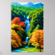 Uma serena cascata chinesa aninhada em meio à bela natureza, cercada por árvores e montanhas coloridas.