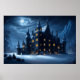 Poster de um castelo gótico escuro aninhado entre árvores antigas e as serras para trás. Acima, a Lua prateada brilha através das nuvens e flocos de neve lançando seu brilho sobre uma cena de ventura pacífica, uma paz externa que desmente o tormento do senhor do castelo. Noite após noite ele passa os dias entre seus túmulos lembrando o que era e o que poderia ter sido. Dos quatro cantos da terra que recebeu a visita de um corvo orgulhoso, uma coruja sábia, uma pomba destemida, e o belo cisne, mas não precisava de nada que pudessem dar em seu coração oco apenas residia a esperança de seu desejo, e a verdade de sua vida era a eterna espera do desejo de se tornar realidade. Esta trabalho de arte de neve e corações ocos foi gerada em Leonardo.ai e então alterada por mim.