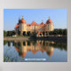 Castelo de Moritzburg, Alemanha, com cúpulas laranja, barroca nas quatro torres e as paredes amarelas refletindo no lago.