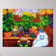 Poster com a pintura de animais de Louis Wain Master of Cat College (1860-1939). Um gato branco pensativo com olhos azuis impressionantes senta-se pesadamente ao lado de uma variedade vibrante de flores bonitas. A majestosa faculdade de gatos venta no fundo sob um céu rosa e azul. Um presente maravilhoso para amantes de gatos e arte inglesa.