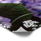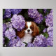 Cavalier King Charles Spaniel cachorro espiando de um leito floral de flores roxas.