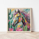 Uma pintura abstrato vibrante e moderna que retrata um cavalo cercado por cactos e suculentos em cores pastéis macios. O cavalo é reproduzido com salpicos de cor ousada, enquanto as plantas do deserto são pintadas com uma mistura de verduras mudas, pinks e blues. A fusão de formas orgânicas e matizes vivas cria uma composição lúdica, mas calmante, misturando elementos naturais com um talento artístico contemporâneo.