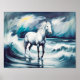 pintura a óleo atmosférico de um cavalo branco parado no mar durante uma tempestade. As ondas dramáticas e o céu escuro criam uma poderosa cena emocional.