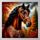 Uma representação espantosa de um cavalo nobre adornado com decorações intrincadas de ouro e joias, colocada contra o pano de fundo vibrante de uma floresta de outono, com cores ousadas e beleza natural cativante.