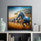 Uma pintura dinâmica capturando a essência de um rebanho de cavalos correndo livremente por um vasto campo, seus músculos tensos, manes fluindo no vento enquanto galopam com graça e poder. Eterna Emboja: Cavalos Galopando Pela Praga