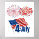 4 de julho em frente à bandeira americana. Dois fogos de artifício explodem.