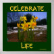 cartaz com narcisos e um fundo parcialmente nevado...texto dizendo Celebre a vida. ótimo para pagãos e wiccanos que reverenciam a natureza e a celebram em toda a sua glória. Bom para Ostara .