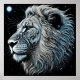 Arte Ai representando um leão preto e branco numa noite mística com fundo estrelado.