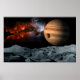 Colagem digital com uma paisagem de lua de ficção científica, com uma nebulosa colorida e um gigante do gás no céu estrelado.
