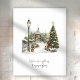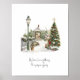 Um inspirador trabalho de arte de aquarela sazonal com pinheiros de Natal, uma lâmpada quente e brilhante e uma casa acolhedora.