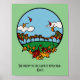 Ilustração Colorida de uma agradável cena paisagística do outono, com nuvens macios flutuando num céu azul com uma colina pequena coberta de grama verde e folhas multicoloridas caindo das árvores. A citação é de Keats e lê: A poesia da Terra nunca é morto.