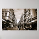 Uma imagem inspirada por um tom sépia que apresenta uma arquitetura francesa típica nos lados esquerdo e direito desta rua pedestrianizada no arrondismo do segundo. Os tons vermelhos do caminhão retrorreflector podem ser vistos viajando pela interseção.
