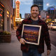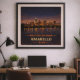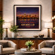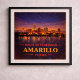 Capture o horizonte amplo e as luzes da cidade cintilantes do Texas Panhandle com este pôster do Centenário de Amarillo. Comemorando o 100º aniversário da Rota 66, esta obra de arte inspirada no vintage apresenta a silhueta de Amarillo refletida na água sob um vasto céu noturno estrelado. O design combina o calor dourado do pôr do sol com tons de índigo profundo, celebrando o espírito robusto e o significado histórico desta grande parada na Mother Road.