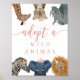 Sinal divertido e fofo para a festa de aniversário do tema safari do seu filho! É uma placa de poster do centro de adoção para uma atividade de aniversário para adotar animais recheados. Tenha uma variedade de animais recheados como favoritos para festas para as crianças irem para casa e "adotarem um animal de estimação." Apresenta ilustração de animais de zoológico com coroas cor-de-rosa, chapéus de festas e flores. O texto diz "adotar um animal selvagem".