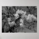Foto preta e branca de um inseto de cereja floresce à luz quente do sol primavera, em frente a um fundo de galhos e do céu.