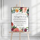 Cartaz de casamento elegante convida os convidados a não usarem dispositivos durante a cerimônia. O design apresenta uma grinalda de flores de verão e outono em aquarela rústica com belas rosas, dálias, flores de peônia e folhagens, em uma paleta de outono magnífica de vermelho burgundy, amarelo dourado, laranja pêssego, rosa rosado e tons de verde.