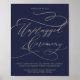 Este cartaz romântico de marinho de caligrafia "cerimônia desconectada" é perfeito para um casamento simples. O clássico moderno design apresenta espirais de rico e turbilhões brancos com belíssima e elegante tipografia de folha de ouro de champanhe com letra falsa. Nota: Este design não apresenta folha de ouro real. É um gráfico de alta qualidade feito para se parecer com folhas de ouro.