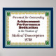 Certificado de Realização para Transcripcionistas Médicos. Perfeito para MTs excepcionais ou MTs para estudantes graduados.