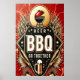 Um design gráfico com uma grelha, cerveja, pedúnculos de trigo, asas e estrelas. O texto Beer CHURRASCO Go Together é exibido em uma fonte em negrito.