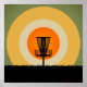 Este design gráfico apresenta anéis coloridos em torno de um cesto de golfe e grama de disco de silhueta.