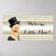 Estandarte de chá de bebê do homenzinho com um lindo bebê menino usando uma fralda preta, sapatos sociais, cartola e gravata borboleta em um fundo preto e bege. Você pode personalizar este estandarte de chá de bebê menino adicionando simplesmente o texto no estilo de fonte e cor de sua escolha. Você também pode redimensionar o bebê para incluir todo o seu corpo.