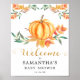 Placa de boas-vindas do chá de bebê da pequena abóbora em aquarela. Apresentando uma abóbora em aquarela repousando sobre uma cama de folhas coloridas de outono e fonte "Bem-vindo" em brilho dourado. Personalize este lindo cartaz de boas-vindas da pequena abóbora de forma fácil e rápida.