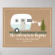 Aventura, chá de fraldas de menino temático com ilustração de trailer de camper retrô azul e branco com roupas de bebê penduradas na linha de roupas conectadas a cada árvore verde. O plano de fundo é o estoque de cartão marrom inspirado.
