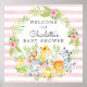 Bem-vindos ao seu convidado em estilo com nosso lindo sinal de boas-vindas ao chá de fraldas, com um elefante fofo, girafa, macaco, zebra e leão enquadrados com folhas da selva e flores de hibisco.