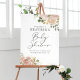 Bem-vindos aos seus hóspedes com esta placa de boas-vindas personalizável do chá de fraldas, com buquê floral de aquarela de flores neutras, folhas de eucalipto e sotaques de folha de ouro falsos. Este design inspirado em boho dá o tom para sua celebração de confirmação. Personalize o sinal de chá de fraldas floral com nomes, data do evento ou uma mensagem especial. É perfeito para entradas de cerimônias, recepções ou fundos de fotos.
