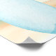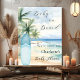 Um sinal de boas-vindas para um Chá de fraldas, celebrando um menino. Uma praia arenosa de cor aquática, ondas oceânicas e palmeiras como fundo, e uma prancha azul na praia.