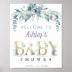 elegante e cúbica cor d'água púrpura e flores azuis com letras douradas sinal de boas-vindas para o chá de fraldas